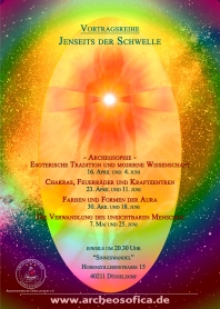 In unserer Themenreihe „Jenseits der Schwelle“ präsentieren wir vom 16. April bis zum 9. Juli verschiedene Aspekte dessen, was über die Wahrnehmung unserer 5 körperlichen Sinne hinausgeht. Wir präsentieren Euch mit unserer ersten Vortragsreihe in Düsseldorf Themen, die die Innerlichkeit des Menschen betreffen und verschiedene Aspekte aufzeigen, wie wir mit unserer Umwelt interagieren und lernen können, bewusster unser Leben zu gestalten.
